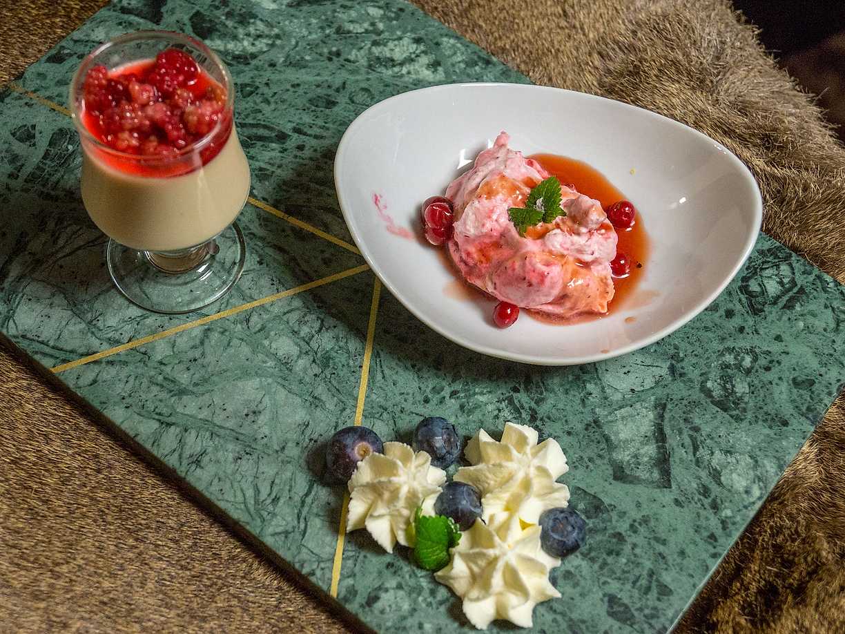 Lingonmousse, blåbär med punschgrädde och åkerbärspannacotta