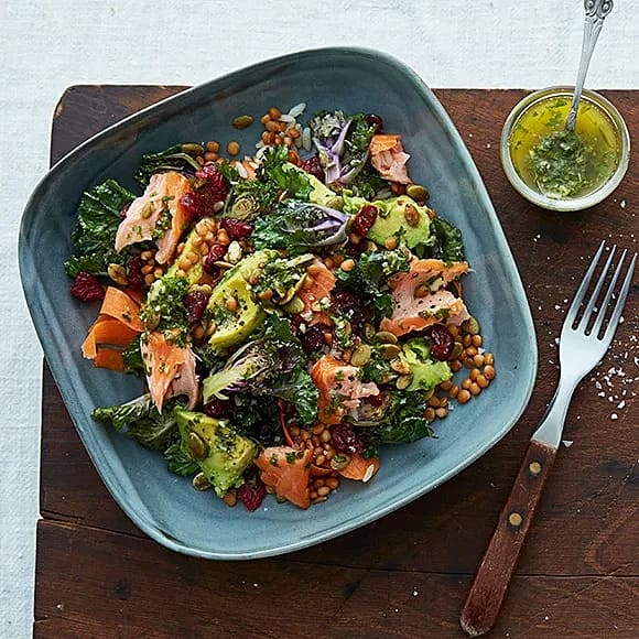 Sallad med varmrökt lax, linser och senapsdressing