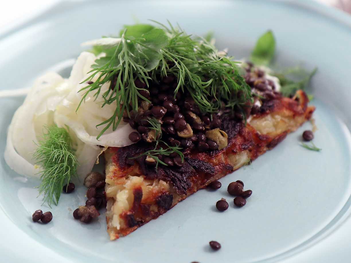 Rösti med svarta linser och gräddfil