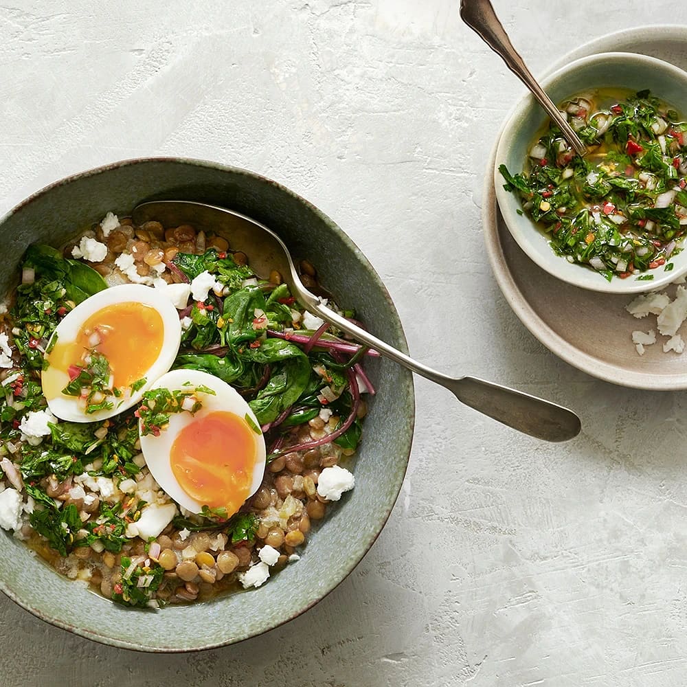 Linsgryta med fetaost och krämigt ägg
