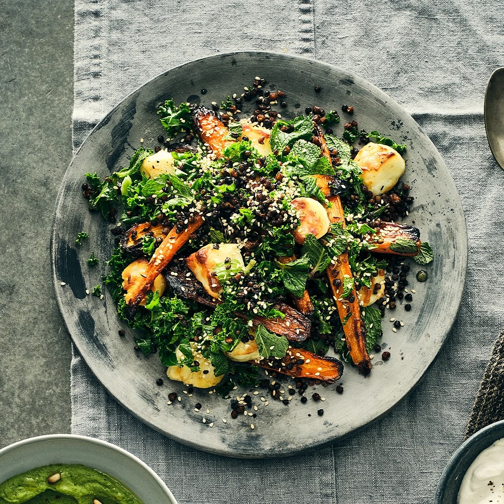 Ljummen linssallad med aubergine, örter och rostade pumpafrön