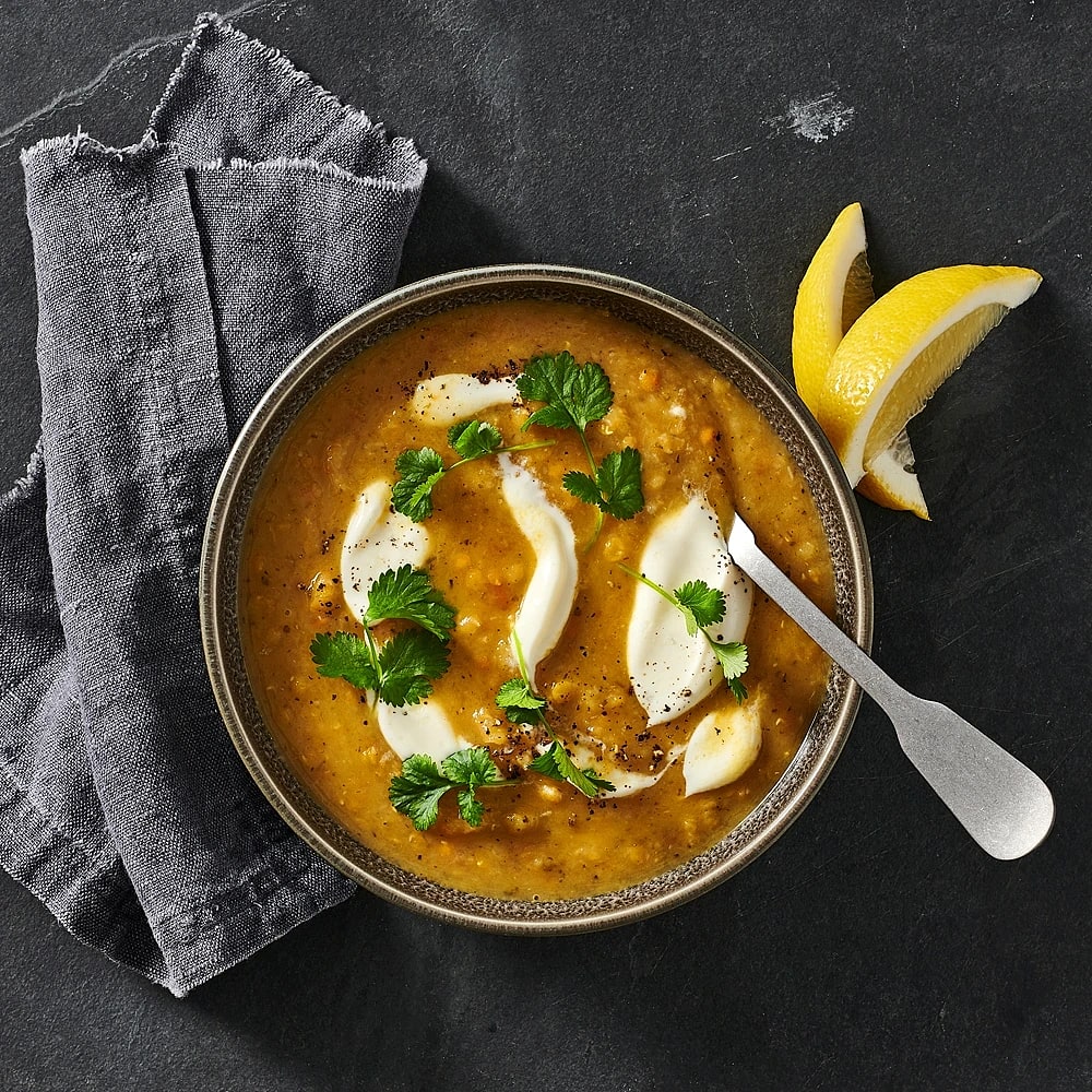 Röd linssoppa med sval citronyoghurt