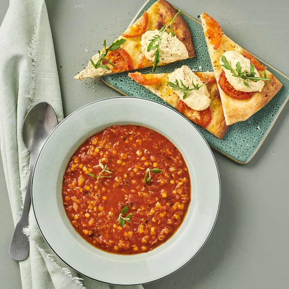 Linssoppa med hummus- och tomatpizza