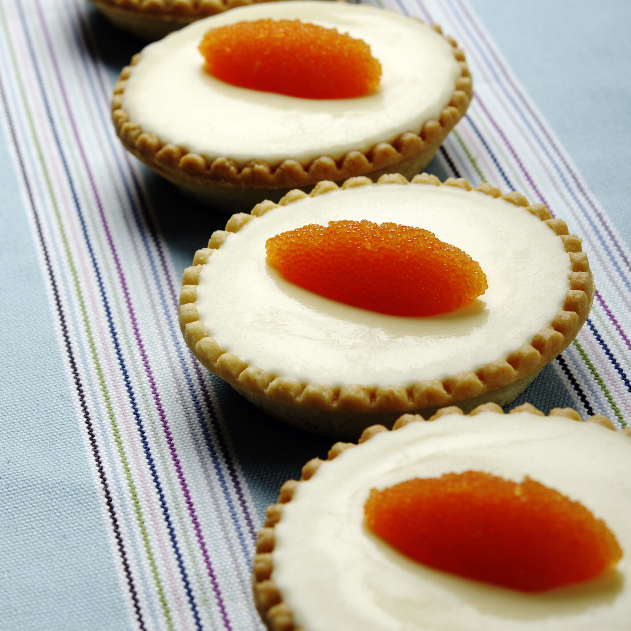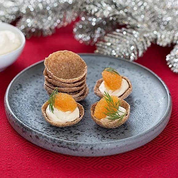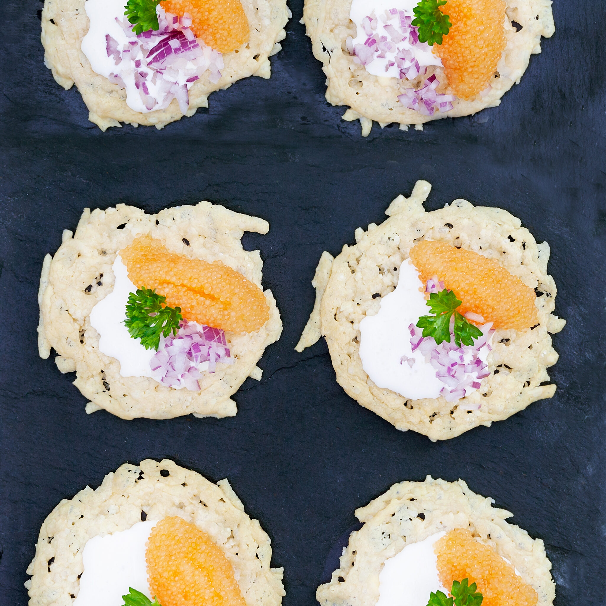 Frasiga parmesanflarn med löjrom, rödlök och citronkräm