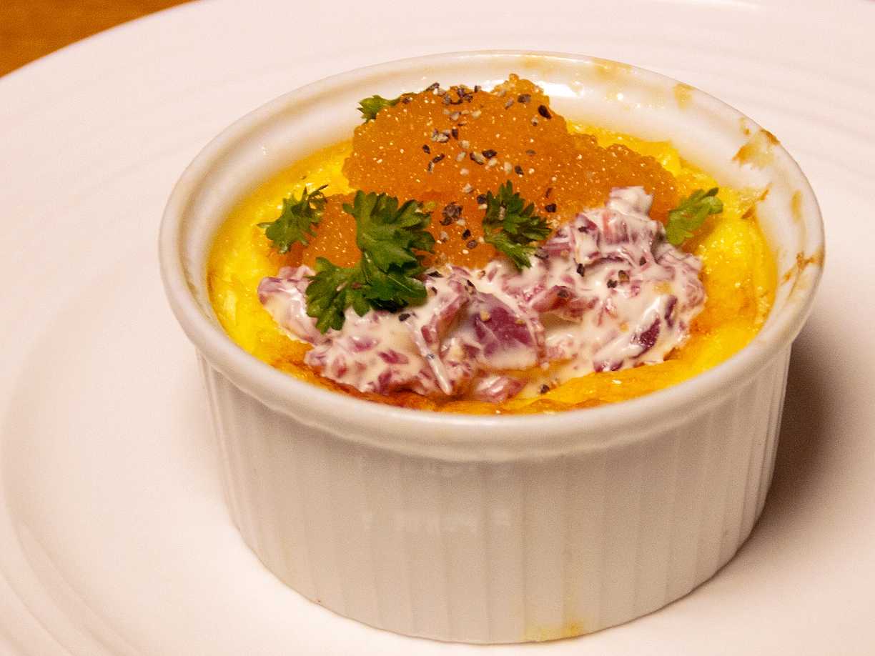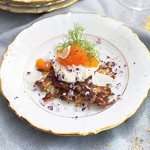 Råraka med löjrom alt sikrom, vispad creme fraiche och rödlök