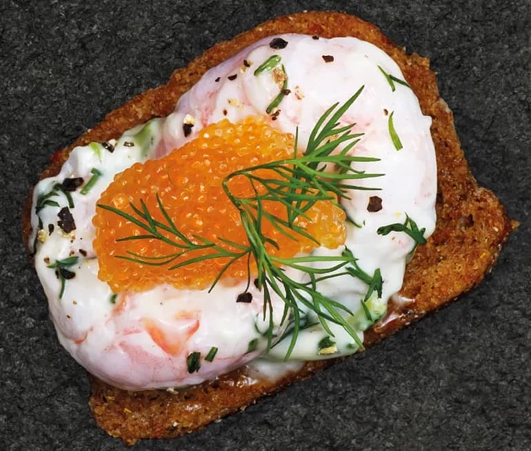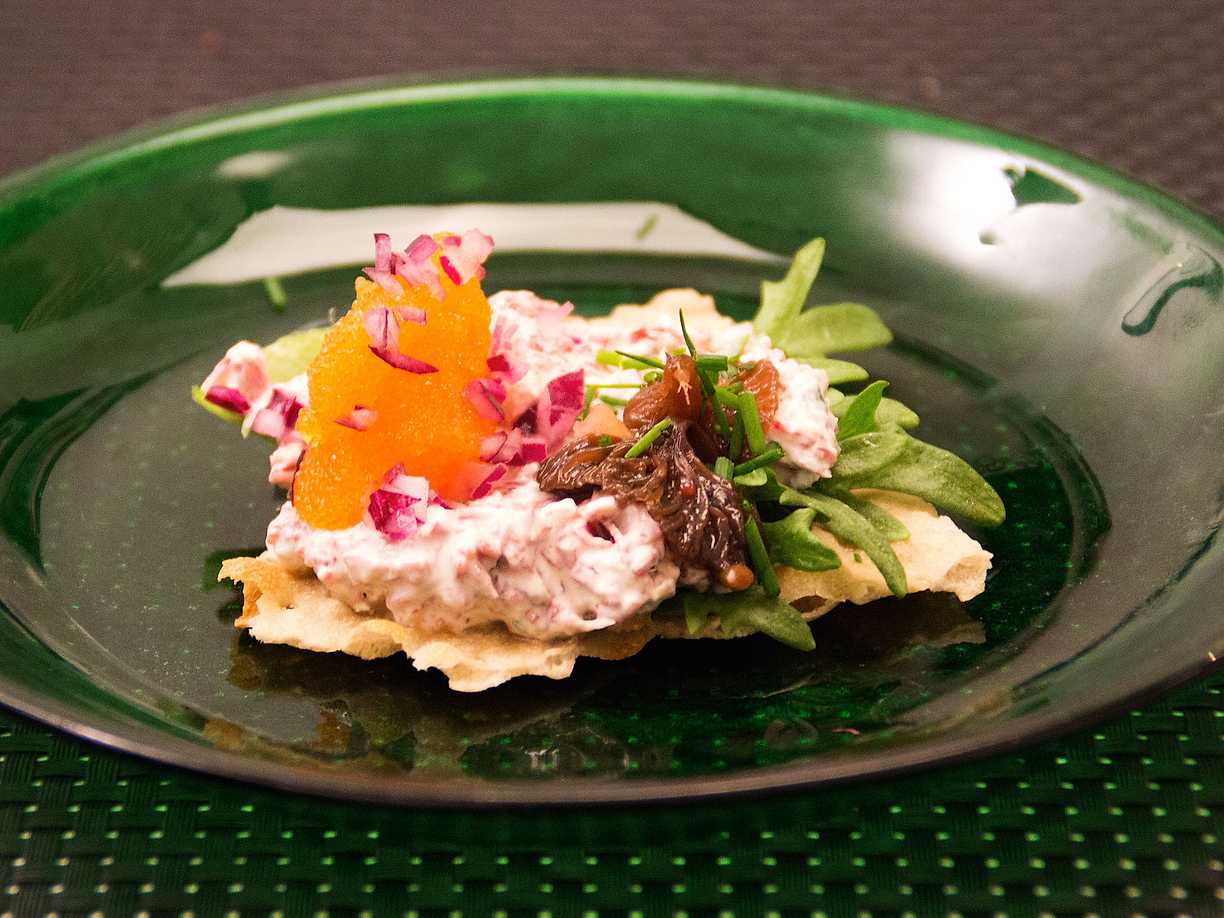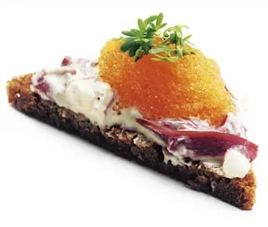 Varmrökt lammfiol på crostini av kavring med örter och löjrom