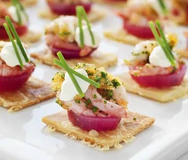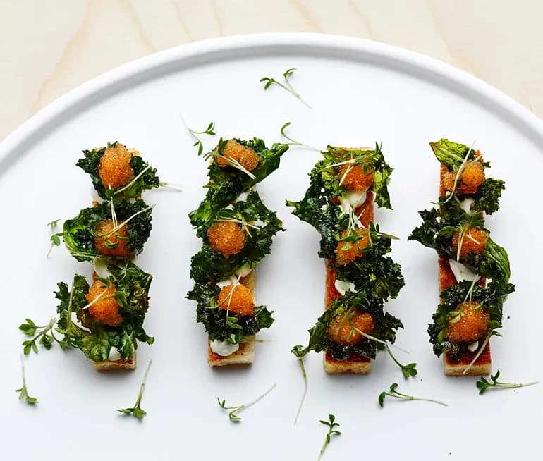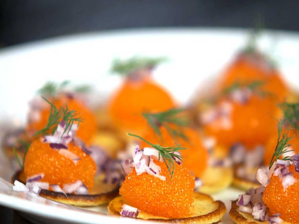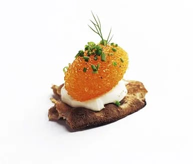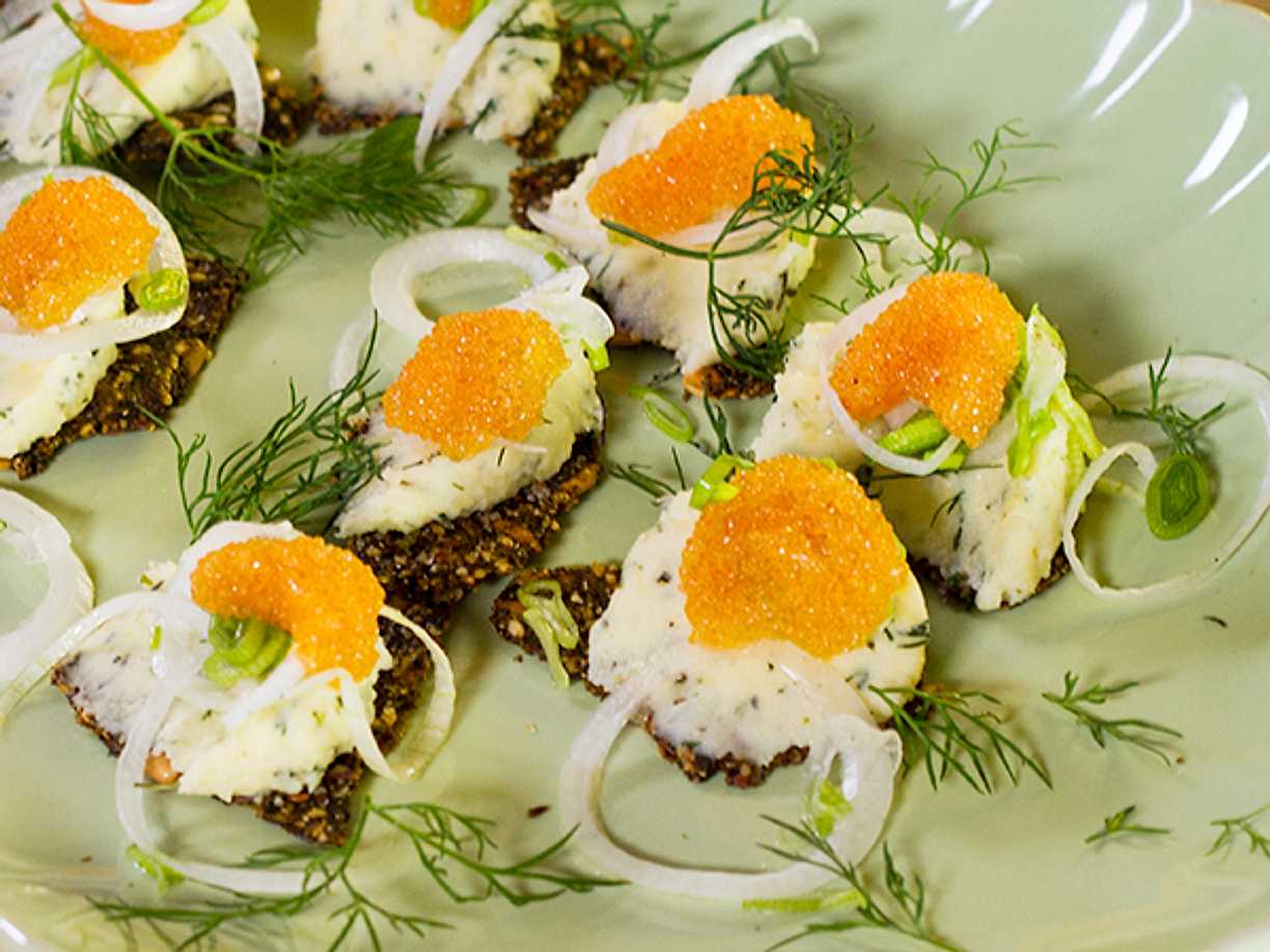 Crostini med citronkräm, löjrom och finskuren rödlök