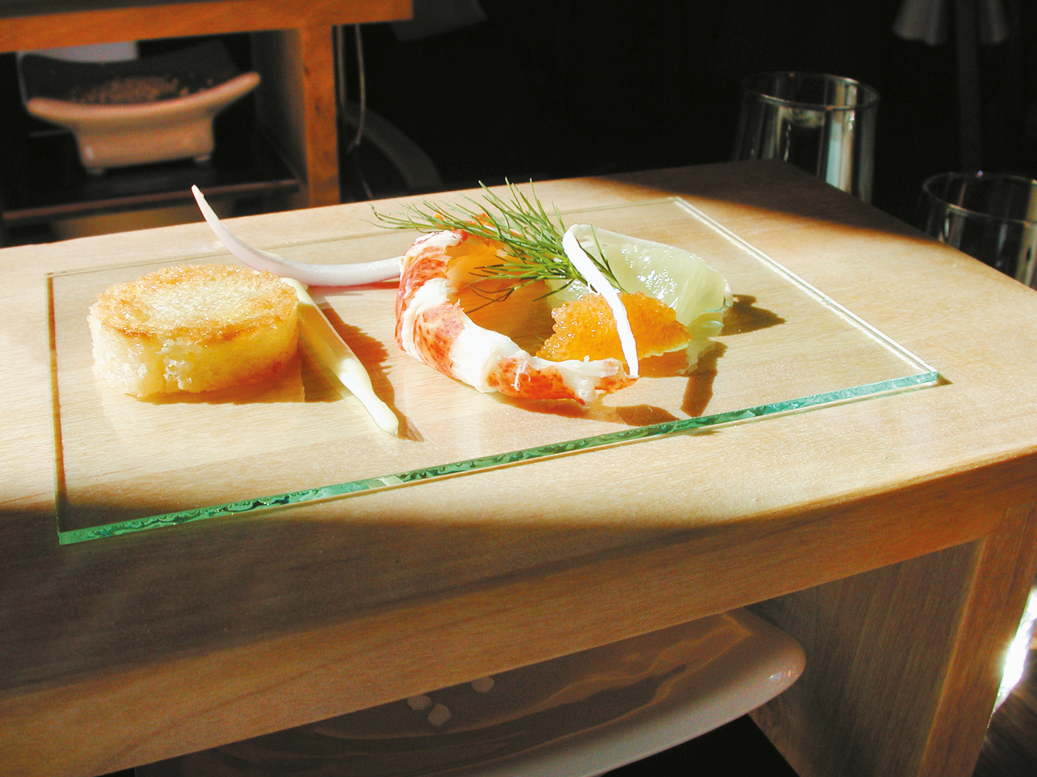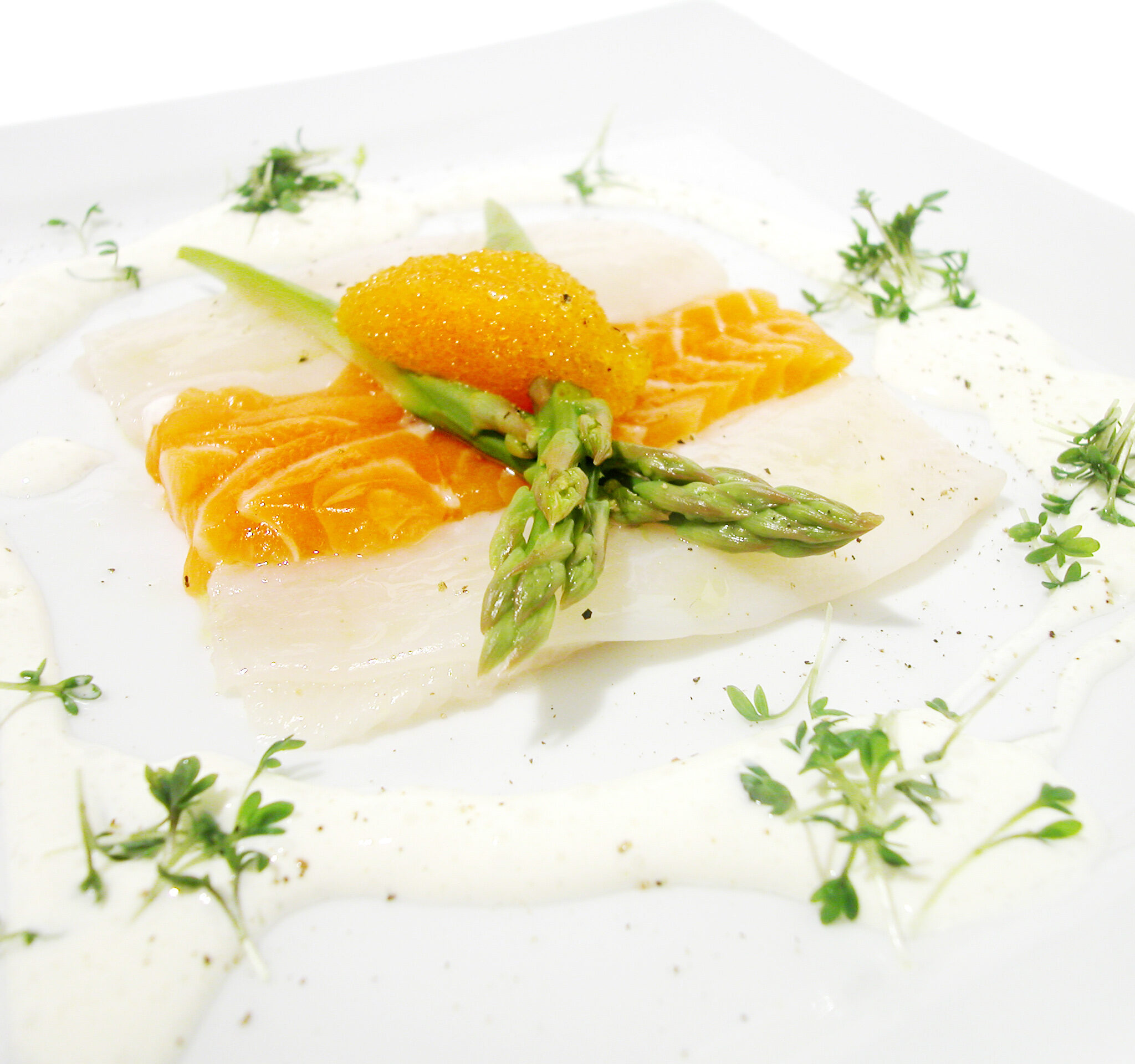 Carpaccio på helgeflundra och lax med pepparrotsskum och löjrom
