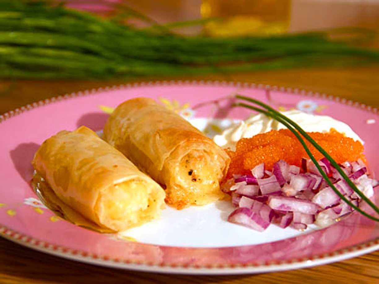 Frasiga smördegsknyten med rökta räkor & löjrom
