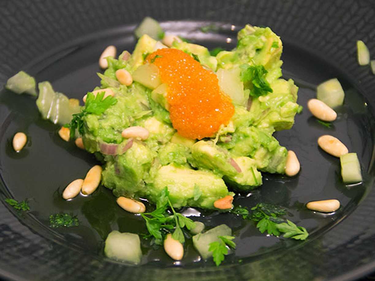 Avokadotartar med löjrom, gurka och rostade pinjenötter