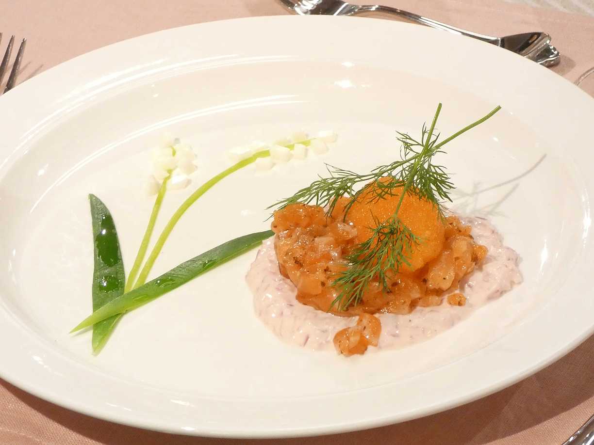 Laxtartar med rostad korianderfröolja, löjrom och rödlökssås