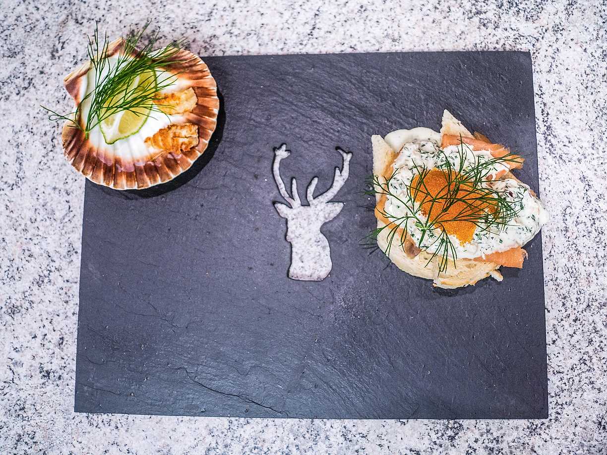 Rökt vildandsbröst, serveras med löjrom och crème fraiche
