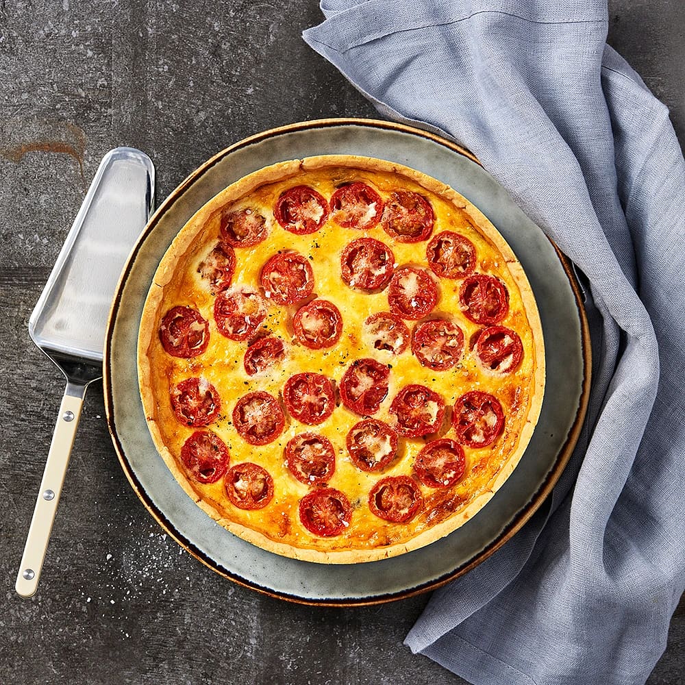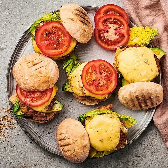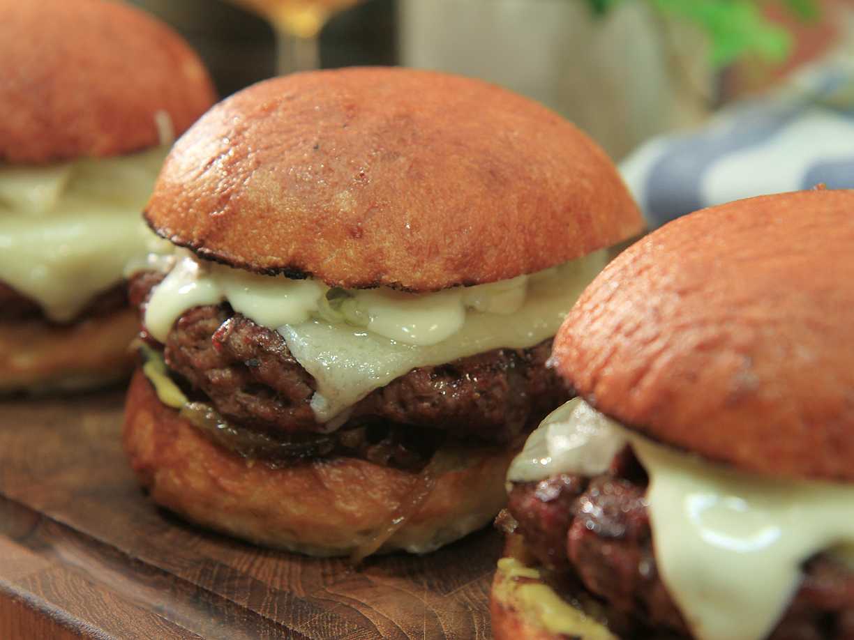 Hamburgare med cheddar, karamelliserad lök, ugnsbakad tomat och tryffelmajonnäs