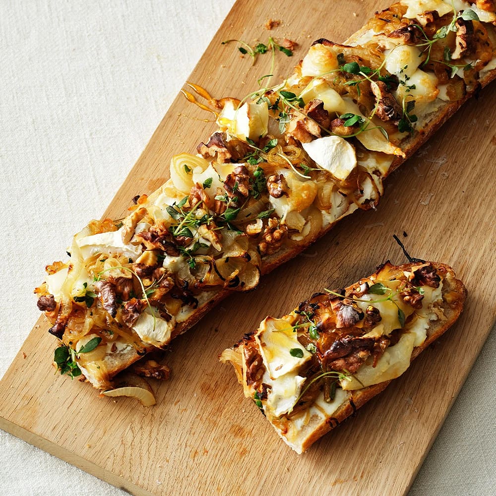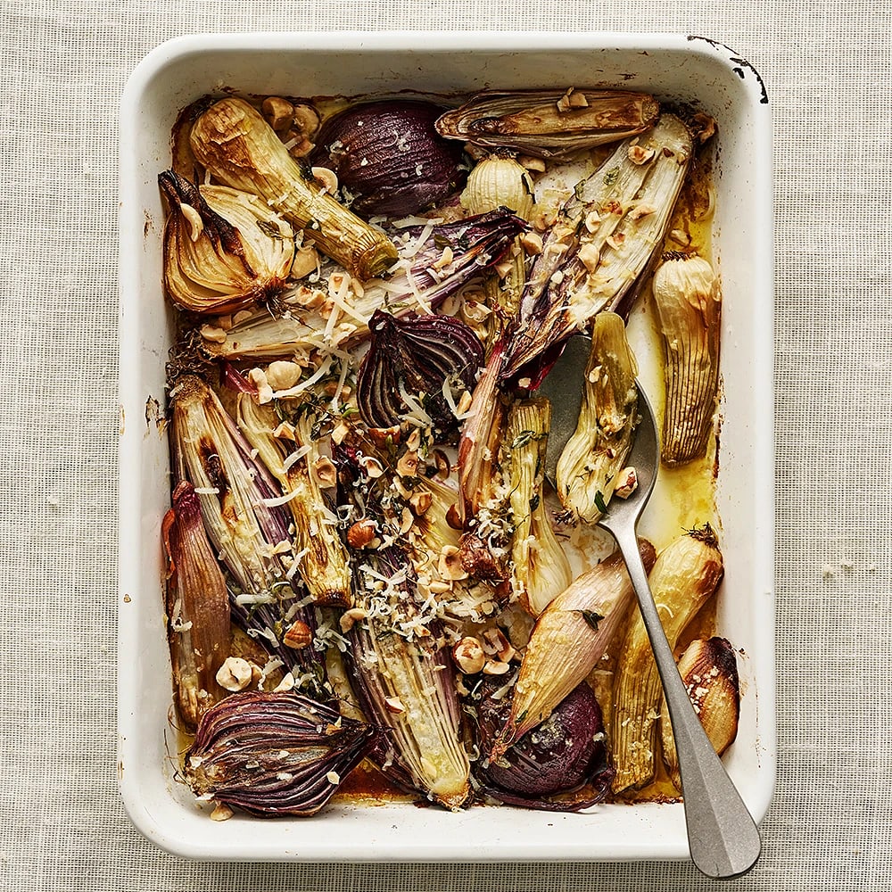 Ugnsbakade lökar med gryère och rostade hasselnötter