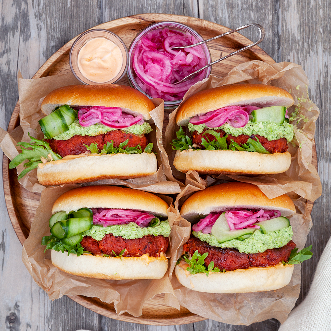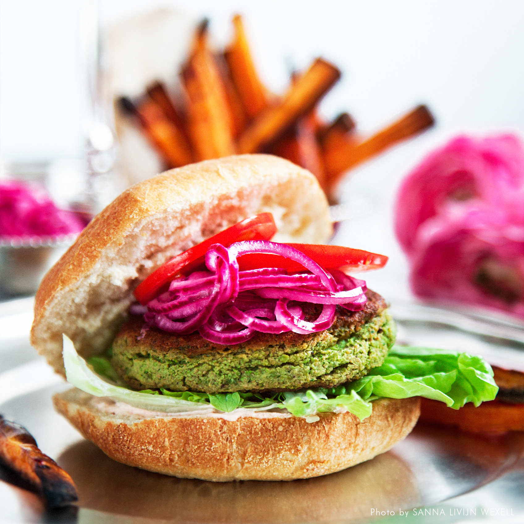 Sojaburgare med sötpotatisfrittes och picklad lök