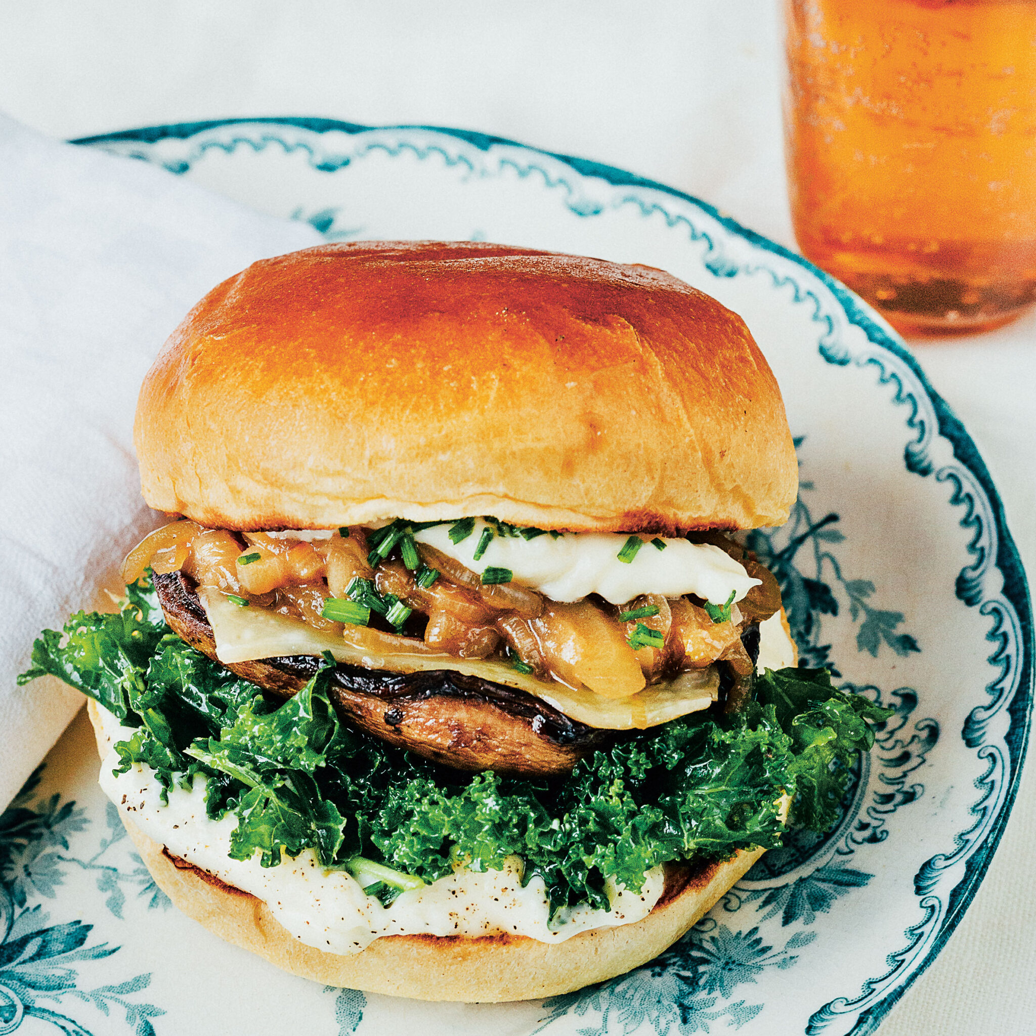 Portabelloburgare med grönkål, tryffelkräm och karamelliserad lök
