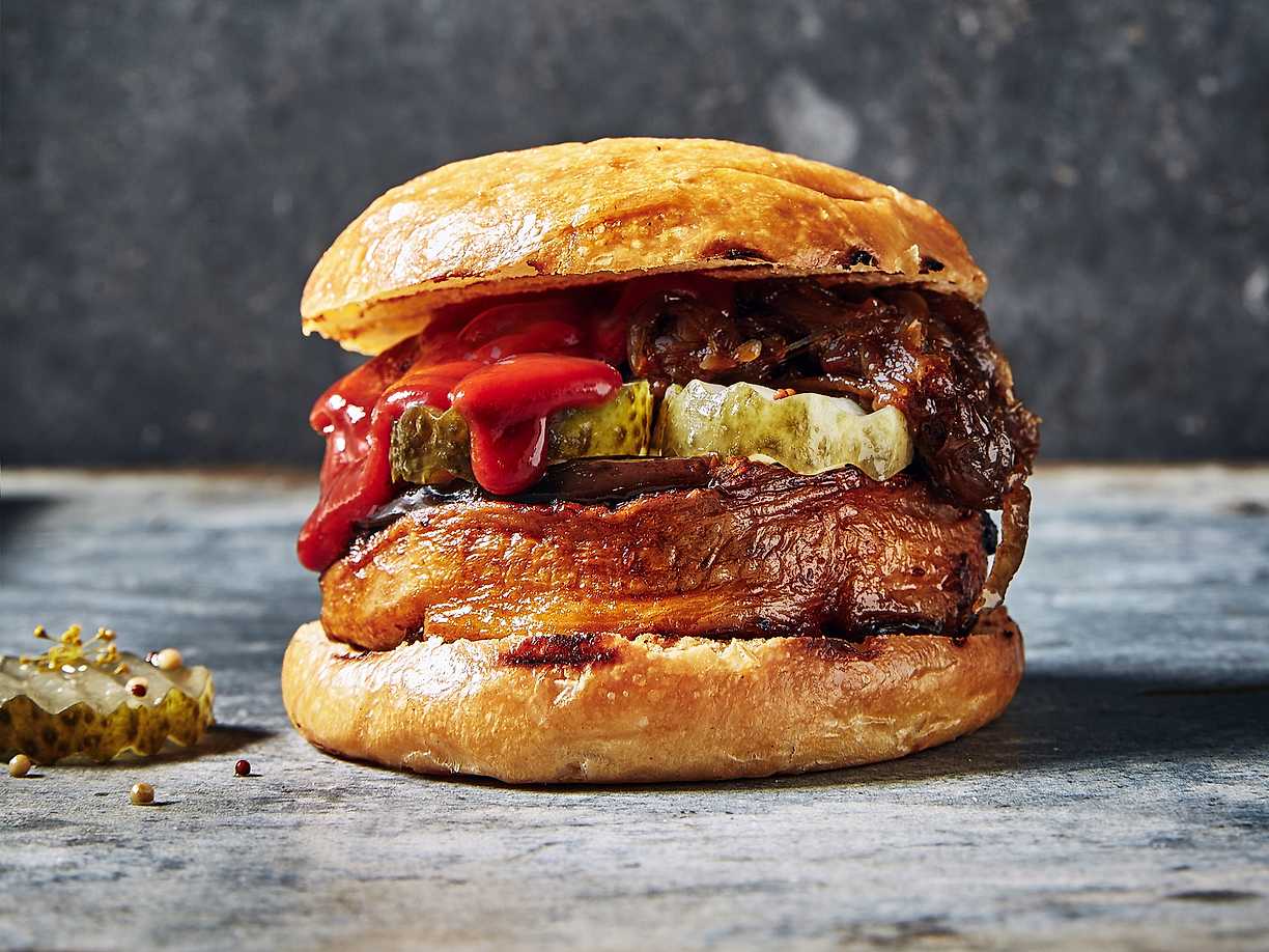 Snurrad aubergineburgare med hemgjord tomatketchup och karamelliserad lök