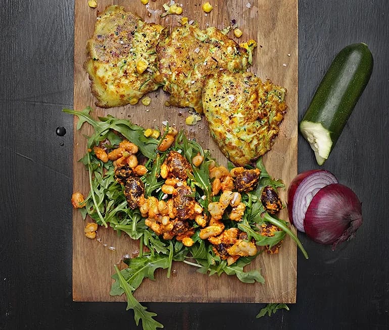 Majs- och zucciniplättar med paprika- bön- och olivsallad