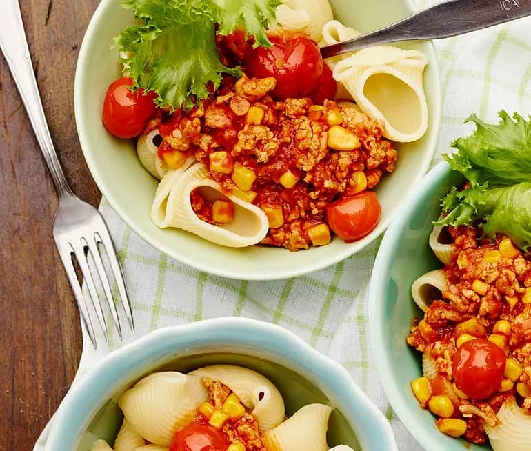 Pasta med majs- och bönbiffar och tomatsås