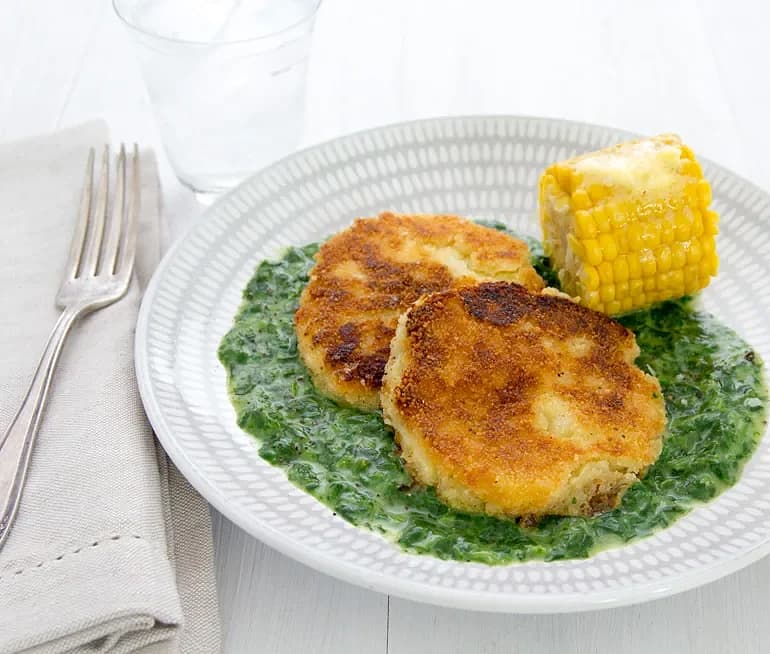 Potatisbullar med stuvad spenat och majs