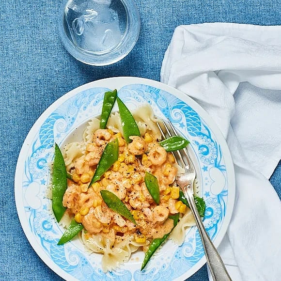 Räkpasta med majs och tomat
