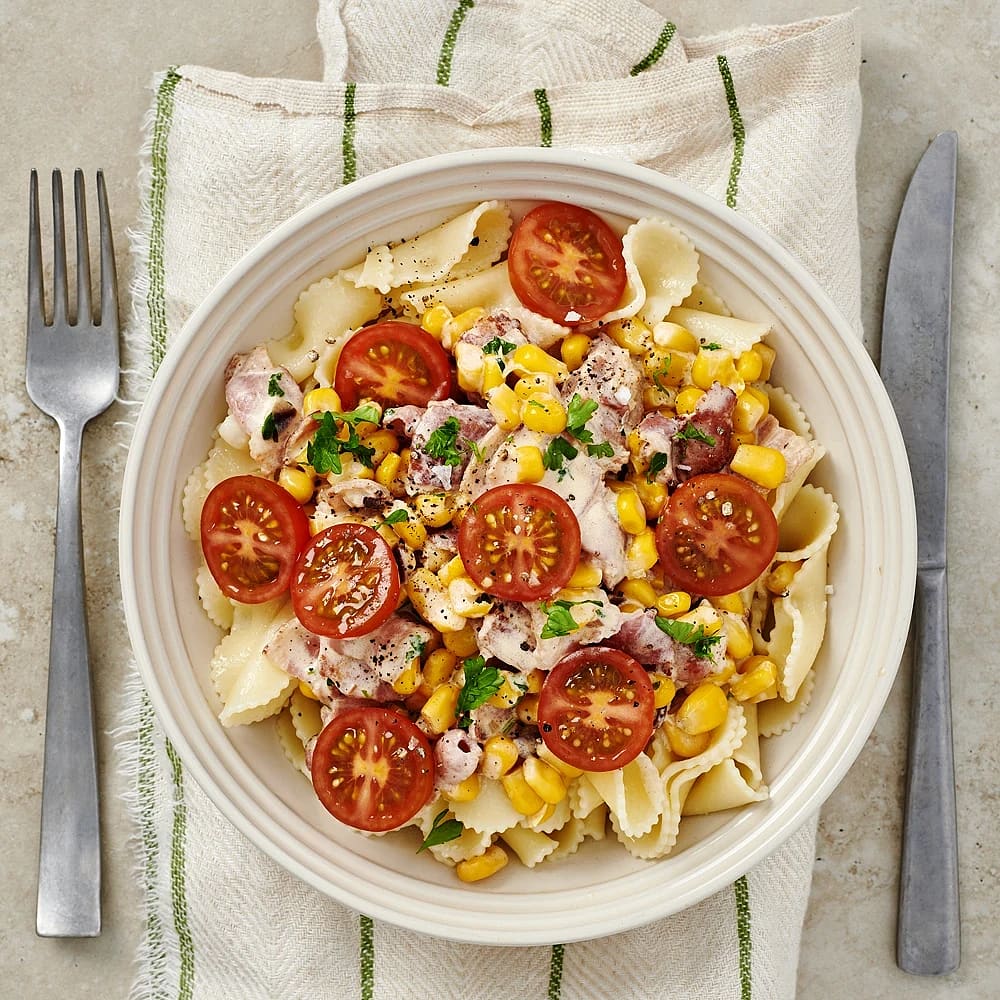 Baconpasta med tomat och majs