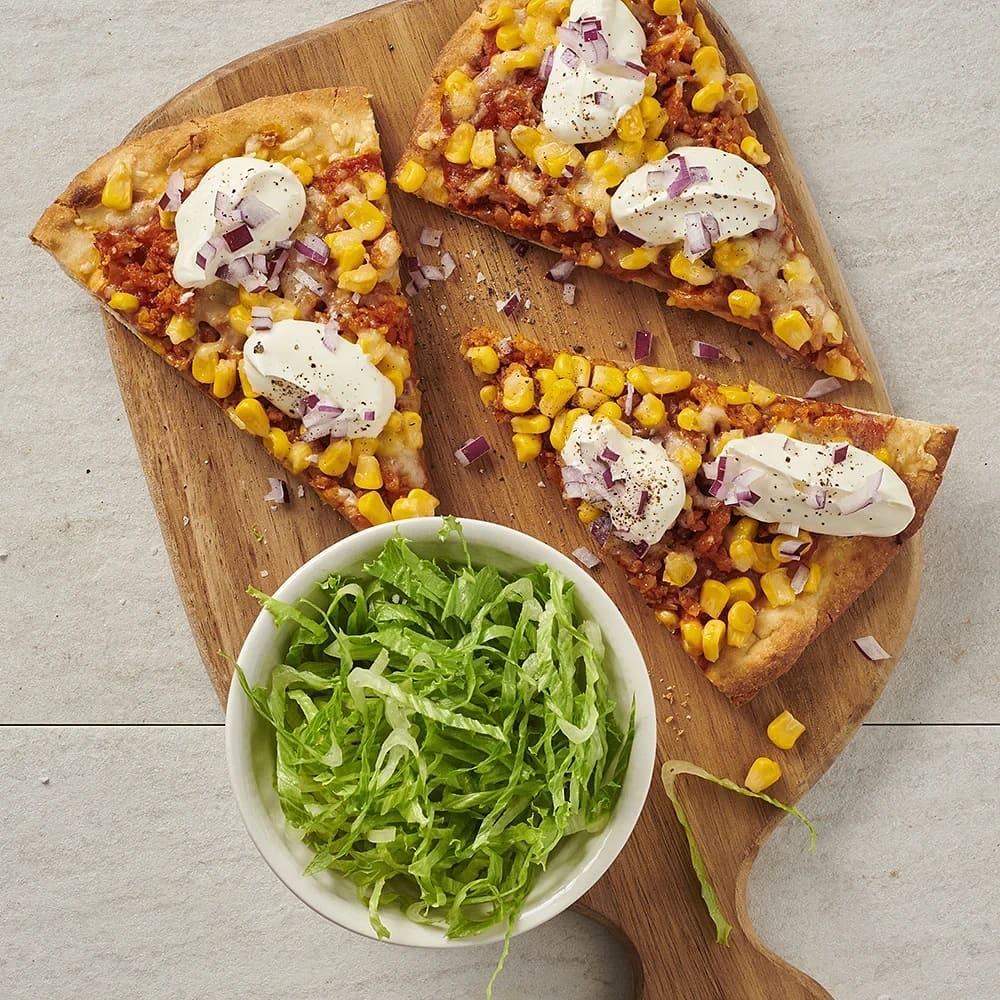 Tacopizza med kycklingfärs och majs