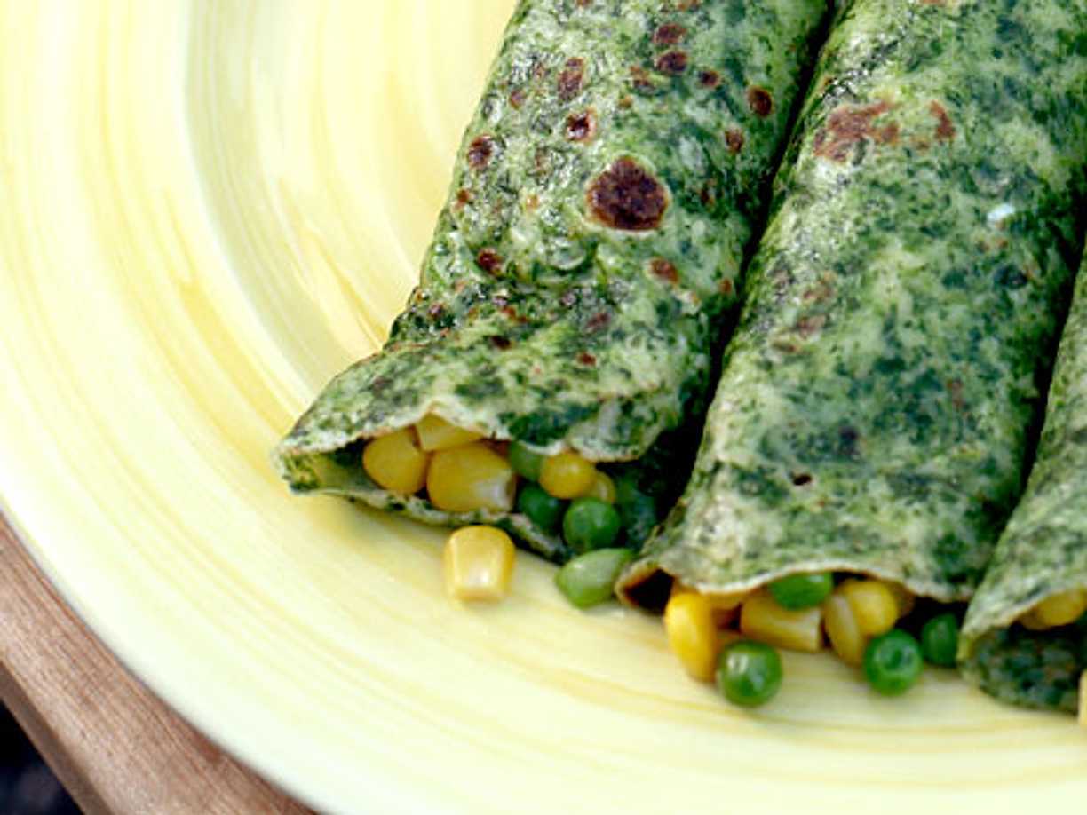 Spenatpannkakor med mozzarella, majs och gröna ärtor