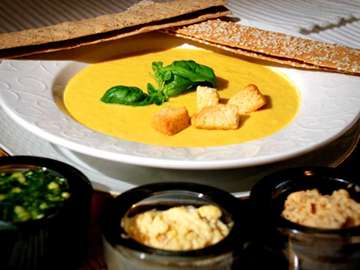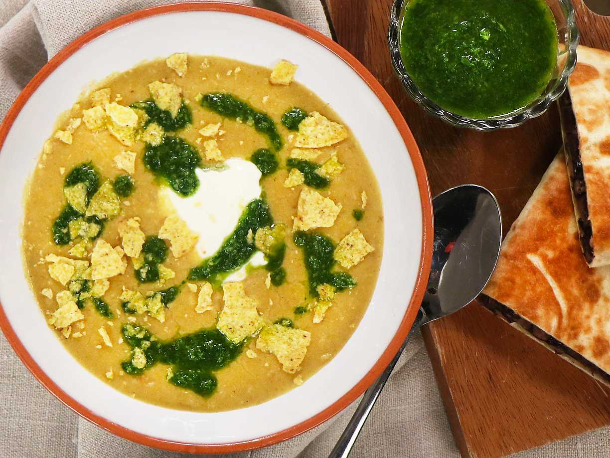 Rostad majssoppa med crème fraiche, nachos och quesadilla