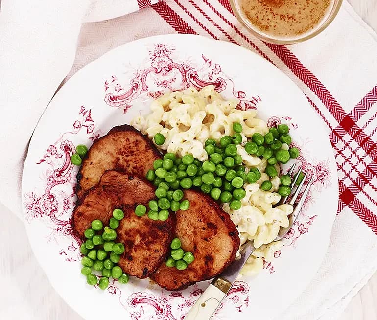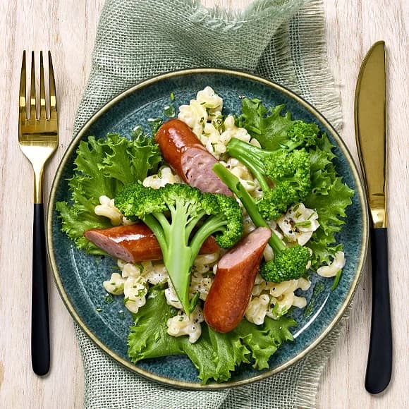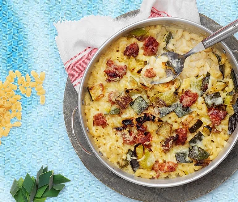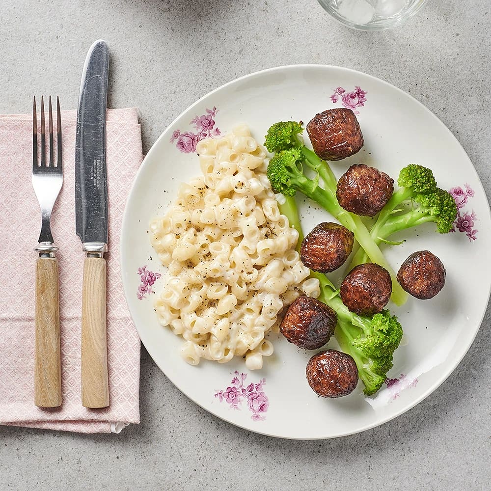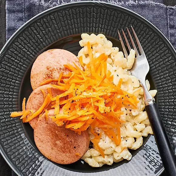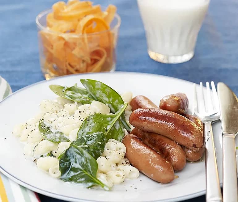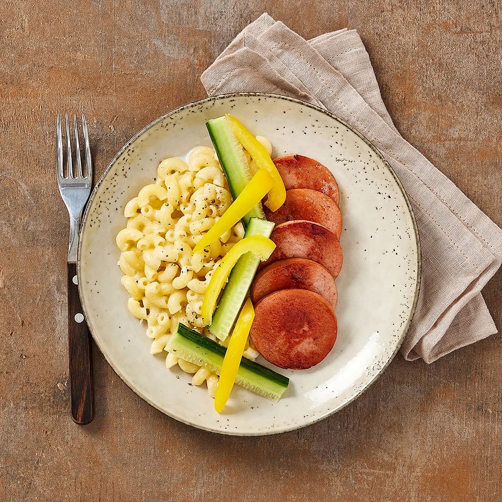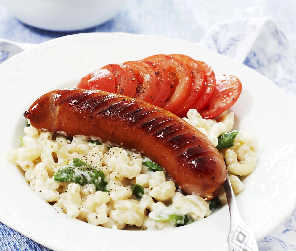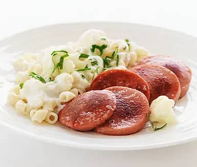 Stekt falukorv med tryffel & blomkålsstuvade makaroner