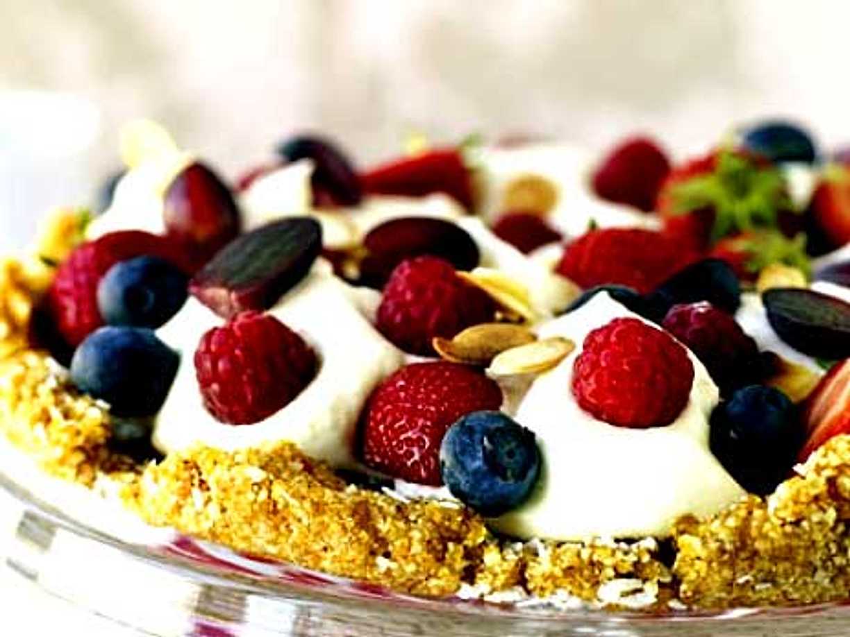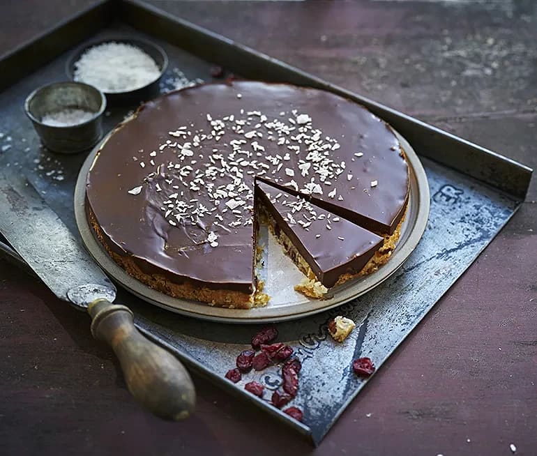Inkokta körsbär på mandel- och valnötsbotten med salt vaniljsås och körsbärsglaze