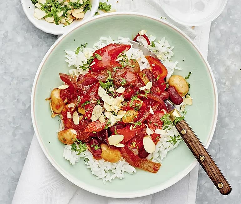Nordafrikansk kycklinggryta med saffran, aprikoser och mandel