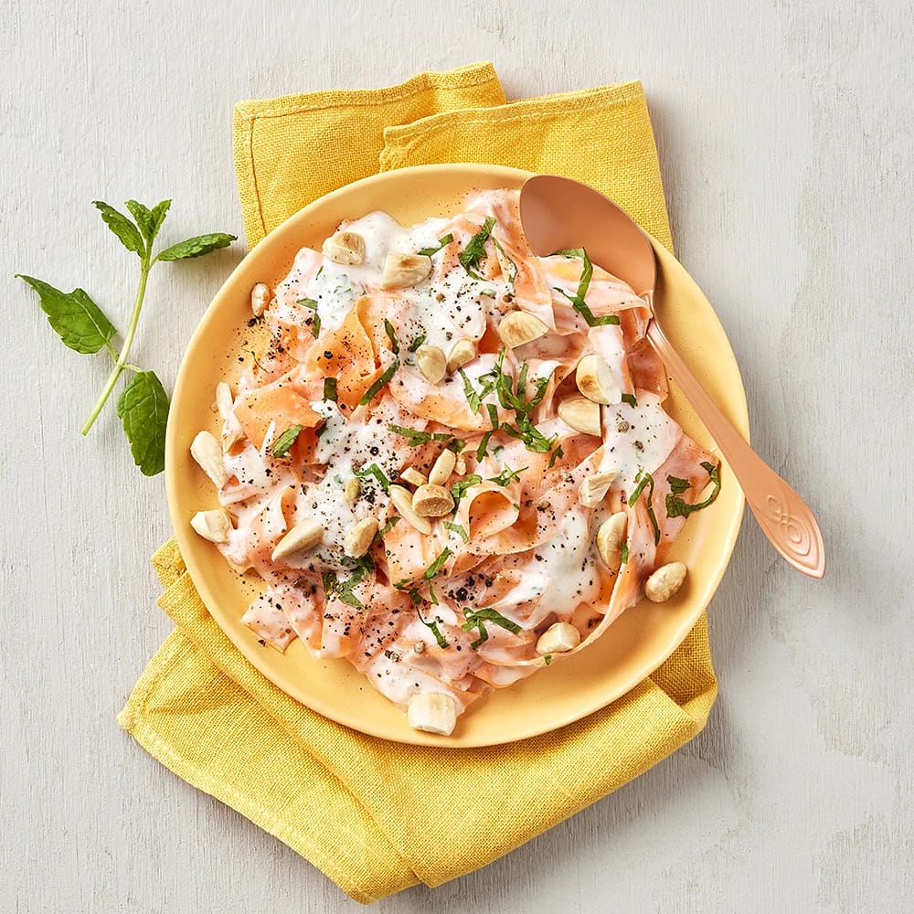 Lamm i tunna skivor med rostad mandel och jordärtskockssallad