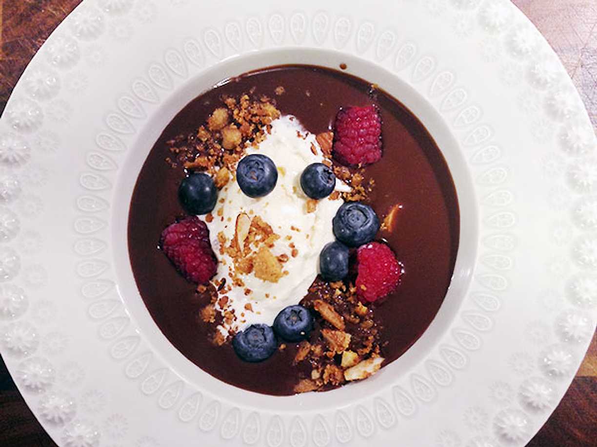 Chokladsoppa, bär samt brynta kaksmulor och mandel