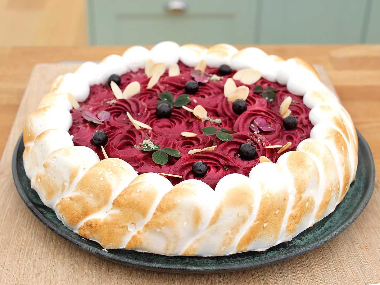 Svarta vinbärstårta med rosmarin, kardemumma- och mandelbottnar samt italiensk maräng