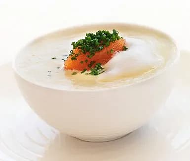 Mandelpotatis och jordärtskockssoppa med skaldjurssallad