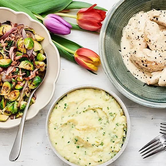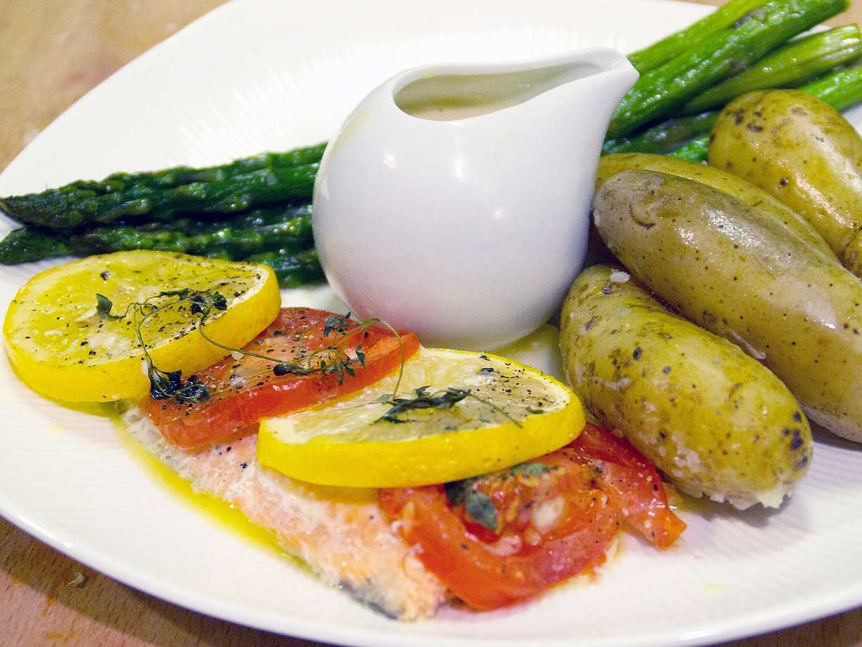 Halstrad gösfilé med krossad mandelpotatis och sandefjordsås