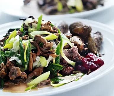 Långkok med mandelpotatis, skogssvamp och rödvinssås