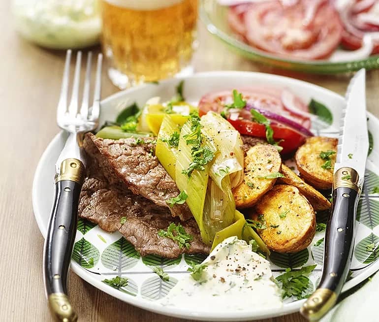 Lövbiff med ölbräserad lök och rostad mandelpotatis