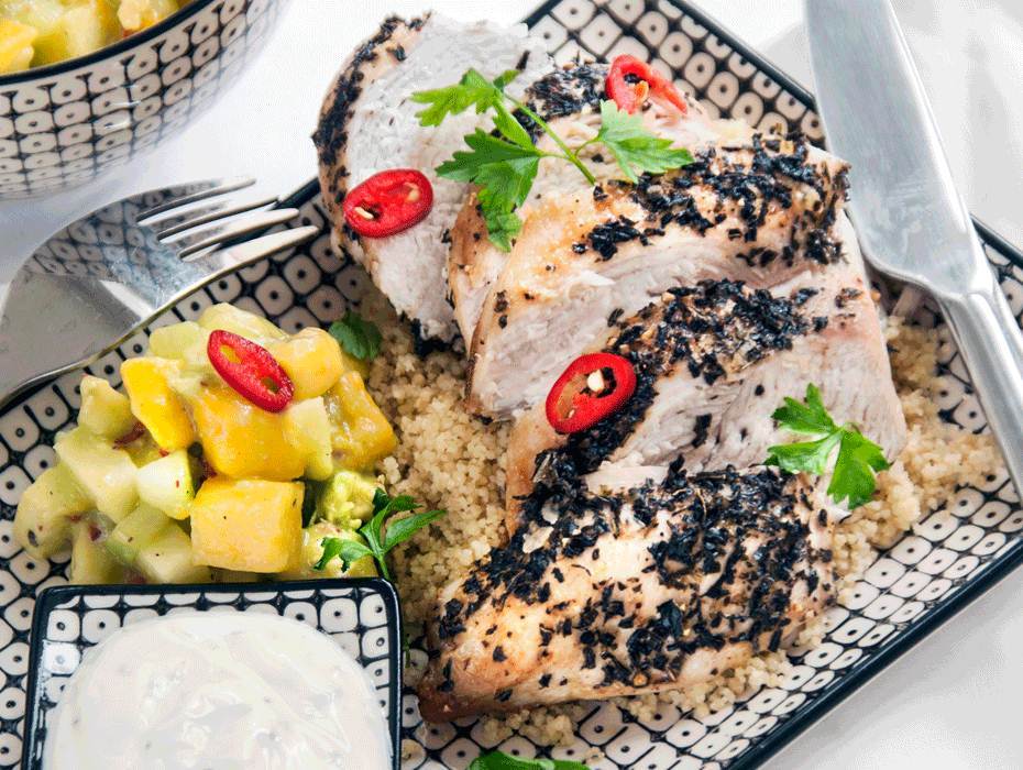 Örtstekt kyckling med avocado och mangosalsa och couscous