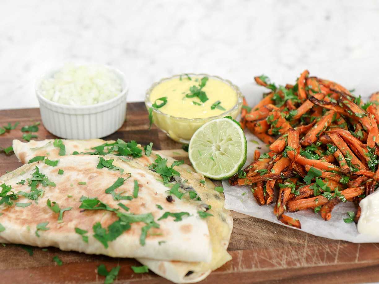 Halloumibiffar med ugnsrostad klyftpotatis, mangosås och grönsallad