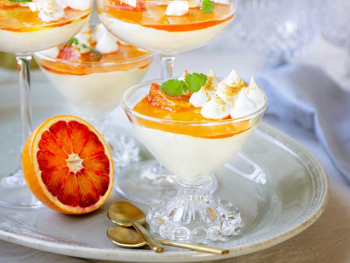 Vit chokladcheesecake med blodapelsinsås och marängtoppar
