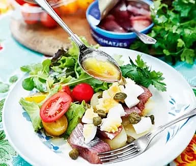 Matjessill med primörsallad, gräddfil och rivet ägg