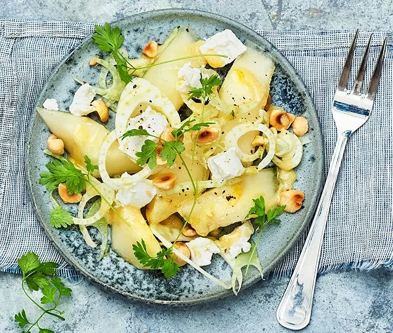 Melon med senapsvinägrett, getost och hasselnötter