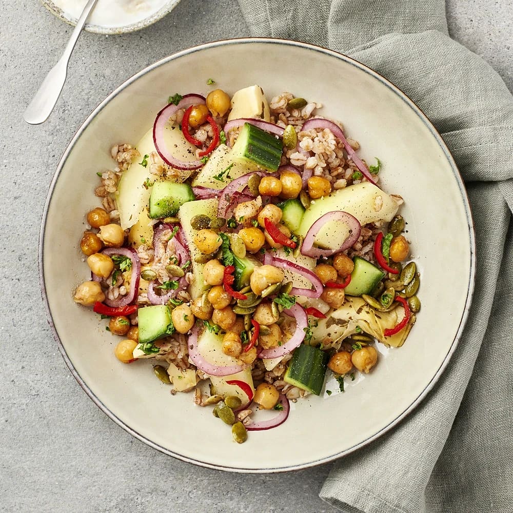 Matvetesallad med melon och chilirostade kikärtor