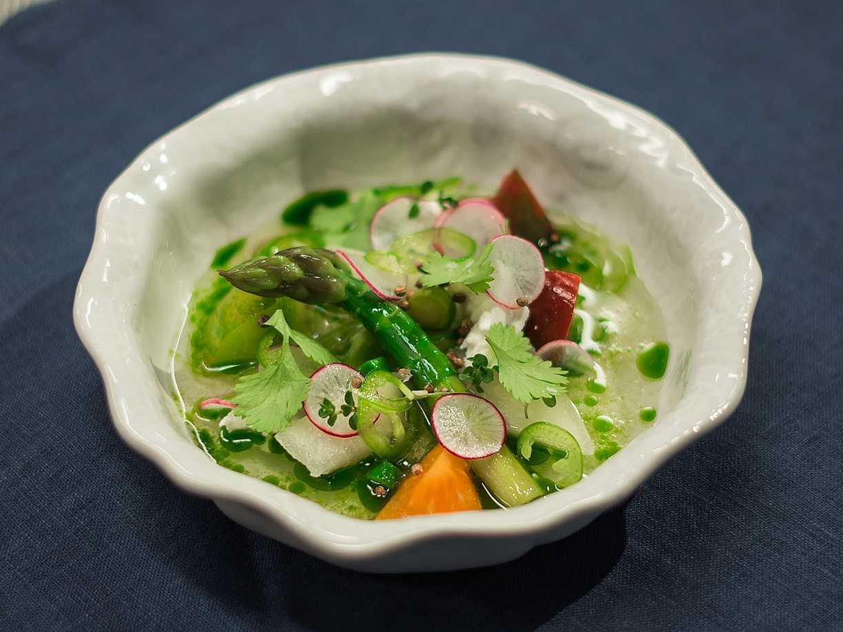 Tomatbuljong, picklad melon, primörer och jalapeñoolja