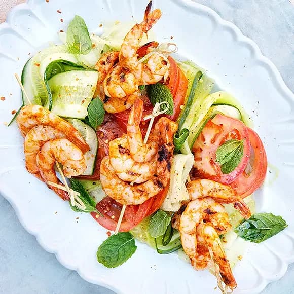 Grillade lammfärsspett med rostad färskpotatis och melonsallad