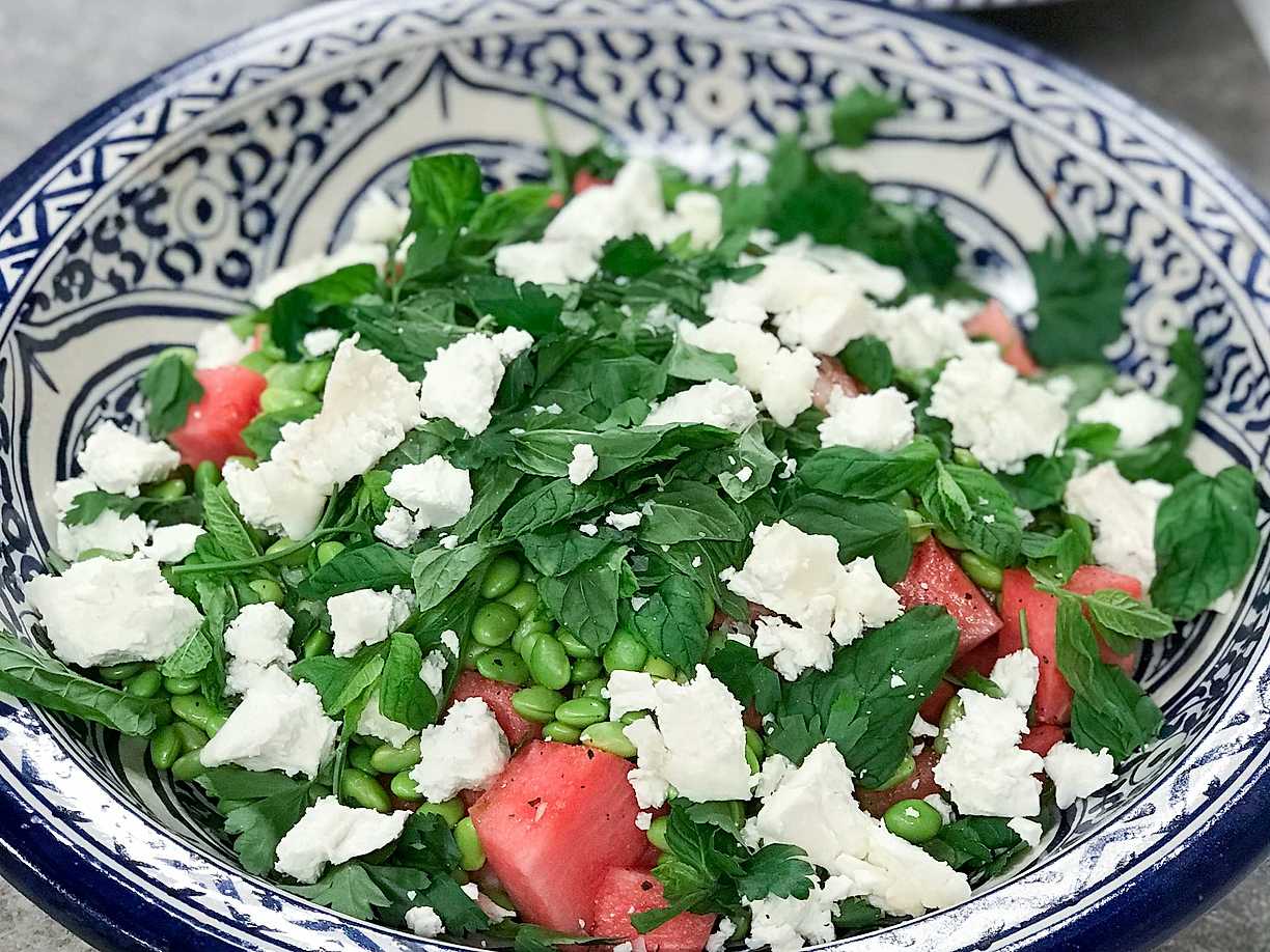 Stekt kyckling med spicy melonsallad toppad med fetaost
