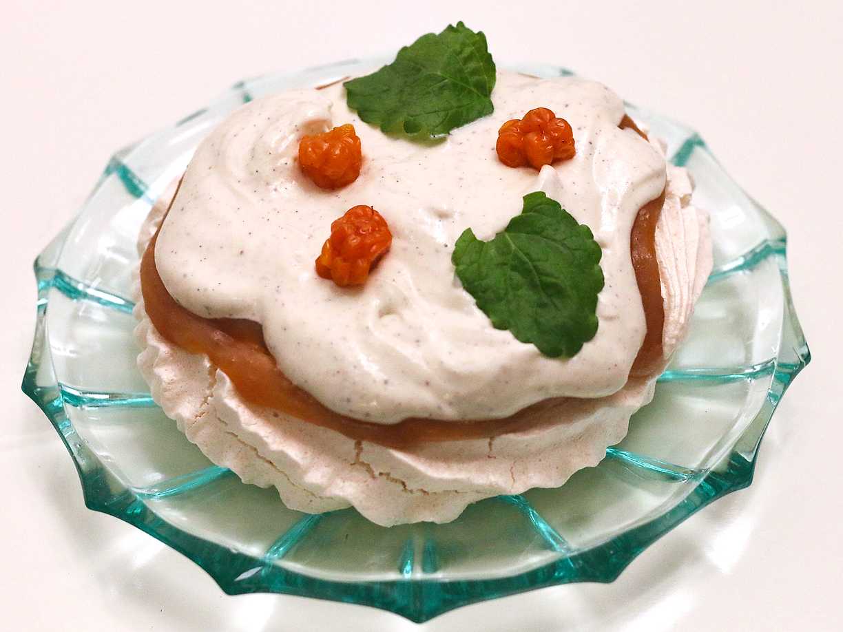 Minipavlova med hjortroncurd och mascarponegrädde
