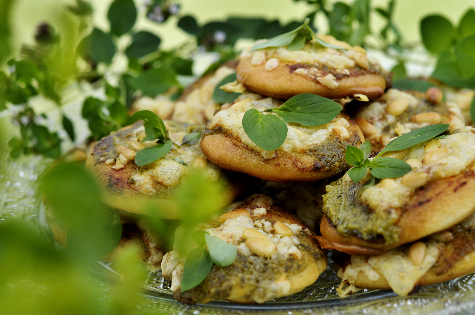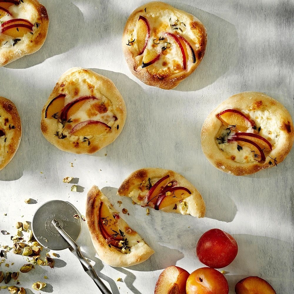 Minipizzor på smördeg med inkokt rödlök, getost och valnötter